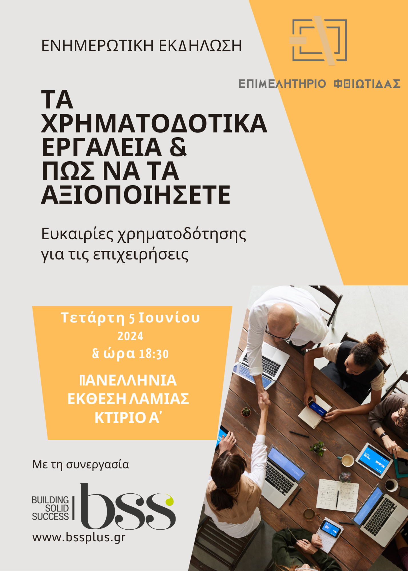 Το Επιμελητήριο Φθιώτιδας σε συνεργασία με την εταιρεία BSS | Building Solid Success διοργανώνουν και σας προσκαλούν σε ενημερωτική εκδήλωση με θέμα: «Τα χρηματοδοτικά εργαλεία & πώς να τα αξιοποιήσετε», την Τετάρτη 5 Ιουνίου 2024 & ώρα 18:30 στις εγκαταστάσεις της Πανελλήνιας Έκθεσης Λαμίας (Π.Ε.Λ.) στην αίθουσα εκδηλώσεων του κτιρίου Α΄.